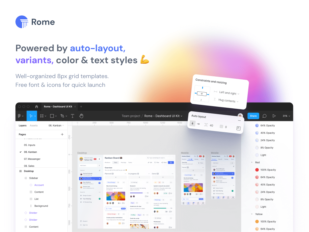 250+ components & 30 templates for desktop & mobile apps. Powered by clean and trendy custom guidelines and DM Sans font (OFL). Customizable & Adjustable dashboard library crafted in Figma. Equipped with ready-to-use app layouts. You can modify them or use as it is to save time and human resources. Try Rome UI kit β a well-organized library to help you design faster and learn Figma by exploring and studying our asset.
